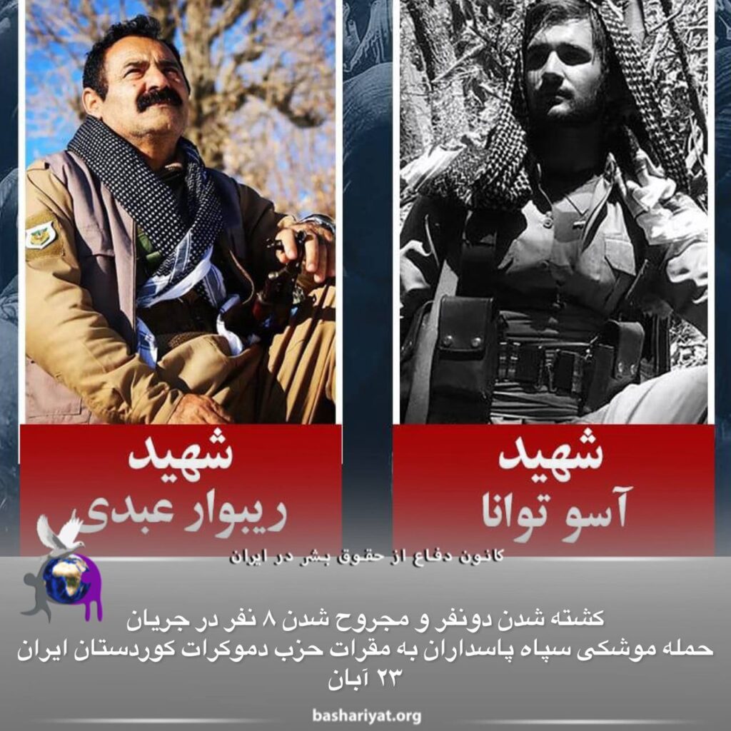 دوشنبە ساعت ٨ و ٤٥ دقیقە ۲۳ آبان ۱۴۰۱، در جریان حملە موشکی سپاه پاسداران بە مراکز و مقرات حزب دموکرات کوردستان ایران دو پیشمرگ بە شهادت رسیدند و هشت تن دیگر نیز مجروح شدەاند.