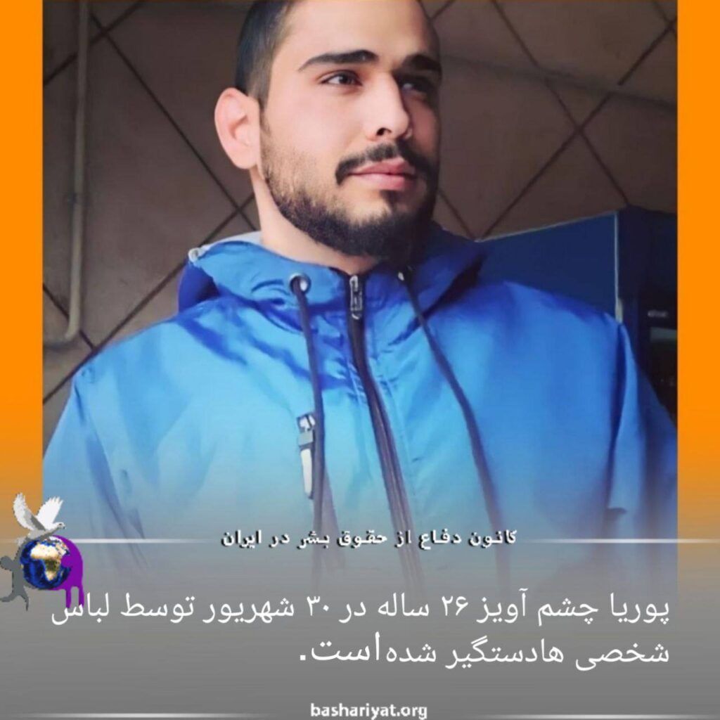 پوریا چشمآویز، ۲۶ ساله، در تاریخ ۳۰ شهریور، توسط لباس شخصیها دستگیر شد. به گفته یک منبع آگاه، بیش از یک ماه است که پوریا زیر شکنجه است.