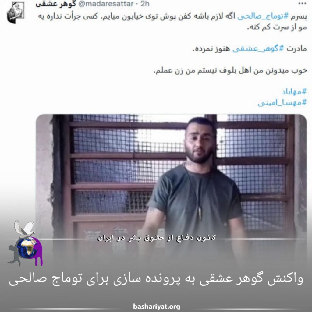 خانم #گوهر_عشقی مادر #ستار_بهشتی در واکنش به خبر امکان صدور حکم اعدام برای #توماج_صالحی اعلام کرد که کفن پوش به خیابان خواهم آمد.