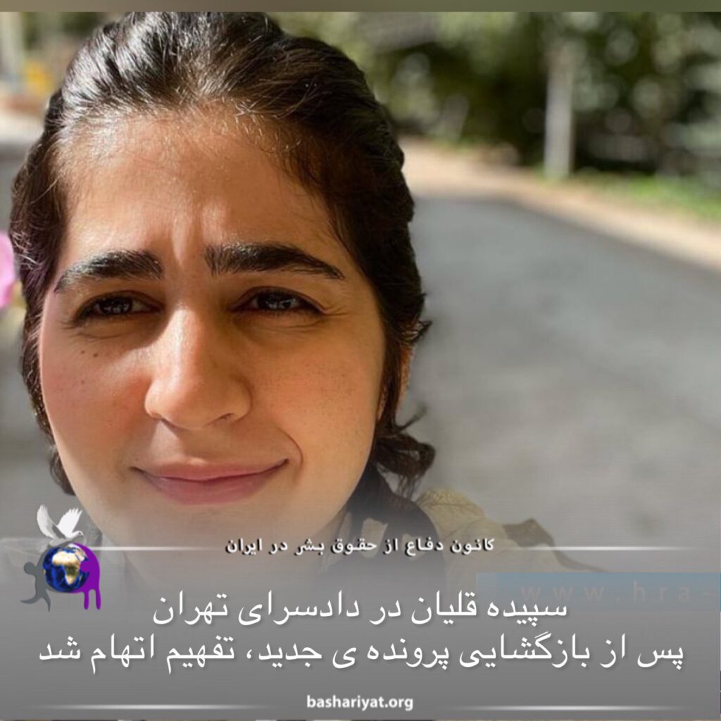 سپیده قلیان، فعال مدنی محبوس در زندان #اوین از بابت پرونده جدیدی که با شکایت اداره کل زندانهای استان بوشهر در دوران حبس علیه وی گشوده شده، طی روزهای اخیر، توسط شعبه ۲ بازپرسی دادسرای عمومی و انقلاب ناحیه ۲۳ تهران به صورت تلفنی تفهیم اتهام شد. براساس این ابلاغیه که در تاریخ ۲۵ آبان ماه ۱۴۰۱، توسط شعبه ۲ بازپرسی دادسرای عمومی و انقلاب ناحیه ۲۳ (ویژه نیابت) تهران صادر شده، خانم قلیان از بابت اتهامات “نشر اکاذیب، توهین به مقدسات و مامورین و انتشار تهمت، افترا، الفاظ رکیک با نسبتهای توهین آمیز” مورد تفهیم اتهام قرار گرفته است.