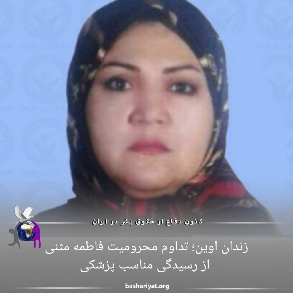 #فاطمه_مثنی، زندانی سیاسی بیمار در زندان اوین، علیرغم حال نامساعد جسمانی و نیاز جدی به درمان تخصصی، کماکان از رسیدگی پزشکی و اعزام به بیمارستان محروم مانده است.