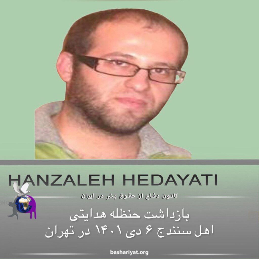 حنظله هدایتی شهروند اهل سنندج و مقیم تهران، در روز سهشنبه ۶ دی ماه ١٤٠١ (٢٧ دسامبر ٢٠٢٢) بازداشت و به مکان نامعلومی منتقل شده است.سید حنظله هدایتی، فرزند هاشم هدایتی، از اعضای کُرد “شورای مرکزی سازمان مجاهدین انقلاب اسلامی ایران” است.به گفته منابع مطلع، شماری از نزدیکان وی نیز که عموماً به عنوان چهرههای نزدیک به اصلاحطلبان شناخته میشوند؛طی هفته جاری بازداشت شدهاند.از محل نگهداری و سرنوشت حنظله هدایتی، تا این لحظه گزارش دقیقی انتشار نیافته است. وی پیشتر نیز توسط نیروهای حکومتی بازداشت شده بود.