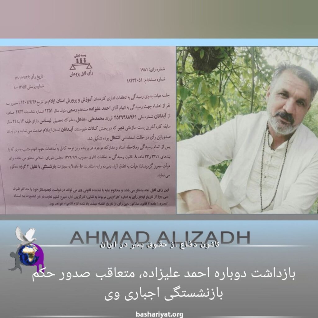 احمد_علیزاده، معلم اهل آبدانان در حالی برای بار دوم طی چهارماهه اخیر بازداشت شده که از سوی دادگاه به “بازنشستگی اجباری” به همراه دو رتبه کسر حقوق و جایگاه محکوم شده است.