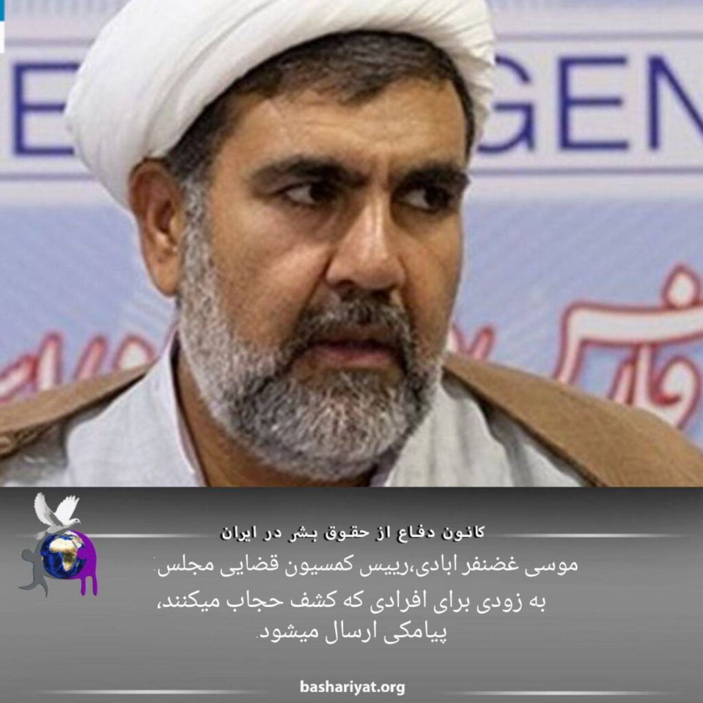 #موسی_غضنفر_آبادی، رییس کمیسیون قضایی مجلس اعلام کرد: «به زودی برای افرادی که کشف حجاب میکنند، پیامکی ارسال میشود و در مرحله بعد و در صورت اصرار بر بیحجابی، فرد جریمه خواهد شد.»