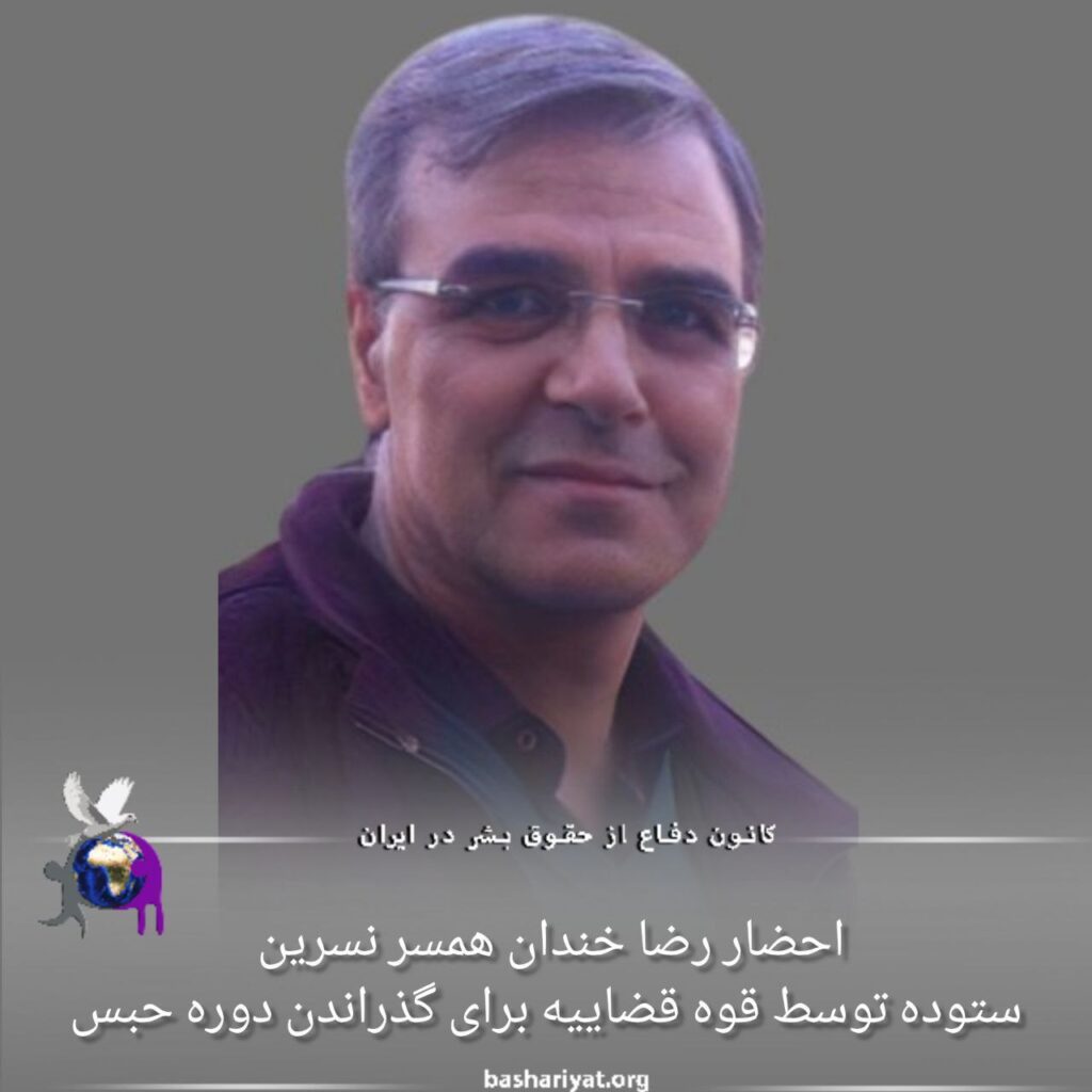 #رضا_خندان، فعال مدنی و همسر نسرین ستوده از سوی قوه قضاییه برای گذراندن دوره حبس احضار شد. او به همراه فرهاد میثمی در پروندهای به شش سال حبس محکوم شده بود اما اجرای این حکم مدتها به تعویق افتاد. دادگاه، رضا خندان را به اتهام «اجتماع و تبانی علیه امنیت»، پنج سال حبس و اتهام «تبلیغ علیه نظام»، یک سال حبس، محکوم کرده بود. اخیرا نسرین ستوده، وکیل فعال حقوق بشر در زمان مرخصی، مصاحبهای را با شبکه «سیانان» آمریکا انجام داده بود و احضار همسر وی به زندان میتواند مرتبط به این موضوع باشد.