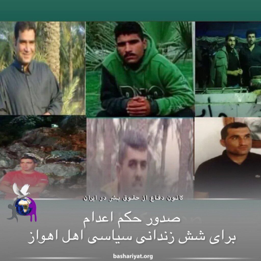 سازمان حقوق بشر اهواز، اعلام کرد که دادگاه انقلاب اهواز برای شش زندانى سياسى عرب در زندان شيبان اهواز، حکم اعدام صادر کرده است.این سازمان در گزارشی، سهشنبه ۲۵ بهمن، اسامی این شهروندان زندانی را «#علی_مجدم»، فرزند صالح؛ «#معین_خنفری»، فرزند صادق؛ «#محمدرضا_مقدم»، فرزند محمدعلی؛ «سید سالم موسوی»، فرزند خلف؛ «سيدعدنان موسوی»، فرزند يونس و «حبيب دريس»، فرزند عبدالامير اعلام کرد.