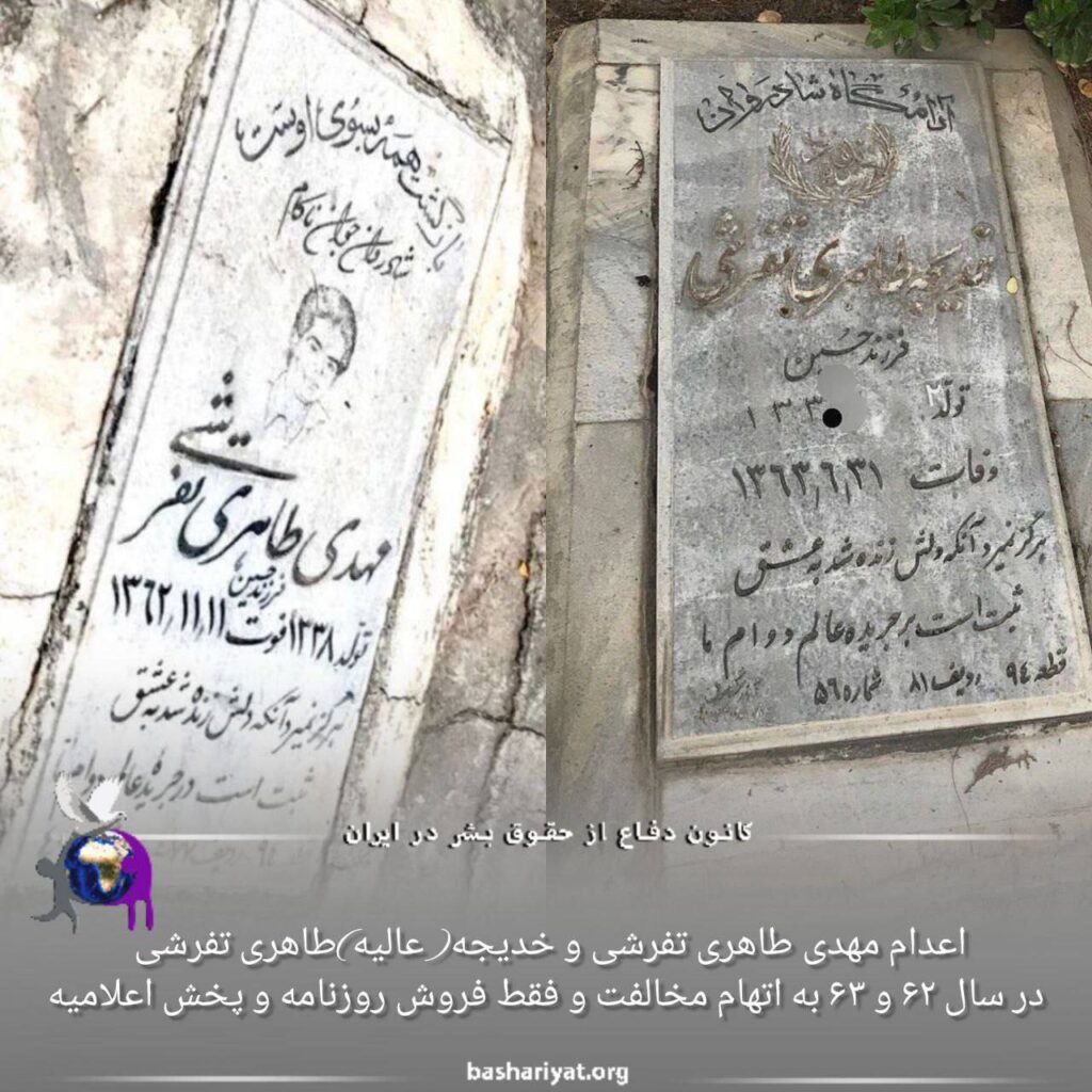 خواهر مهدی طاهری تفرشی و خدیجه (عالیه) طاهری تفرشی از اعدام خواهر وبرادرش نوشت:خدیجه متولد ۱۳۳۲ و مهدی متولد ۱۳۳۸ بودند هر دو رو به فاصله شش و نیم ماه از همدیگه اعدام کردند به جرم مخالفت و فقط فروش روزنامه و پخش اعلامیه که براشون پرونده سازی کرده بودند به مدت دو سال در زندان نگهداری کردند و بعد در سال ۶۲ و ۶۳ رژیم جمهوری اسلامی اعدامشون کرده بود.