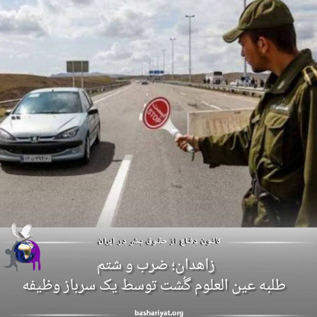 زاهدان؛ ضرب و شتم طلبه اهل سنت عین العلوم گُشت توسط یک سرباز وظیفه.یک طلبه اهل سنت مدرسه دینیعین العلوم گُشت، به بهانه «حمل سلاح سرد» توسط یک سرباز وظیفه در نزدیکی ترمینال #زاهدان مورد ضرب و شتم قرار گرفت.