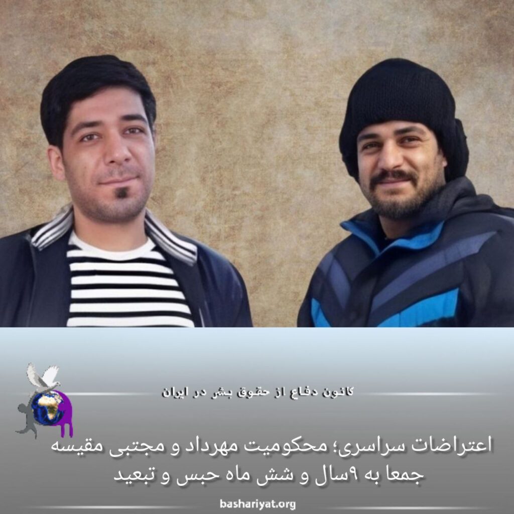 اعتراضات سراسری مهرداد مقیسه مجتبی مقیسه شهروندان ساکن سبزوار و از بازداشت شدگان اعتراضات سراسری ۱۴۰۱، توسط شعبه ۱ دادگاه انقلاب این شهرستان هر کدام مجموعا به ۹ سال و شش ماه حبس تعزیری و دو سال تبعید محکوم شدند.بر اساس این حکم که توسط شعبه ۱ دادگاه انقلاب سبزوار به ریاست قاضی غلامی صادر و به آقایان مهرداد و مجتبی مقیسه ابلاغ شده، آنها هر کدام به صورت جداگانه از بابت “درگیری با نیروهای حافظ امنیت و اداره گروه و دعوت به اغتشاشات و درگیری” به شش سال حبس تعزیری و از بابت “اجتماع و تبانی علیه امنیت کشور” به سه سال و شش ماه حبس تعزیری و به مدت دو سال تبعید به شهرستان های خور و بیابانک محکوم شده اند.