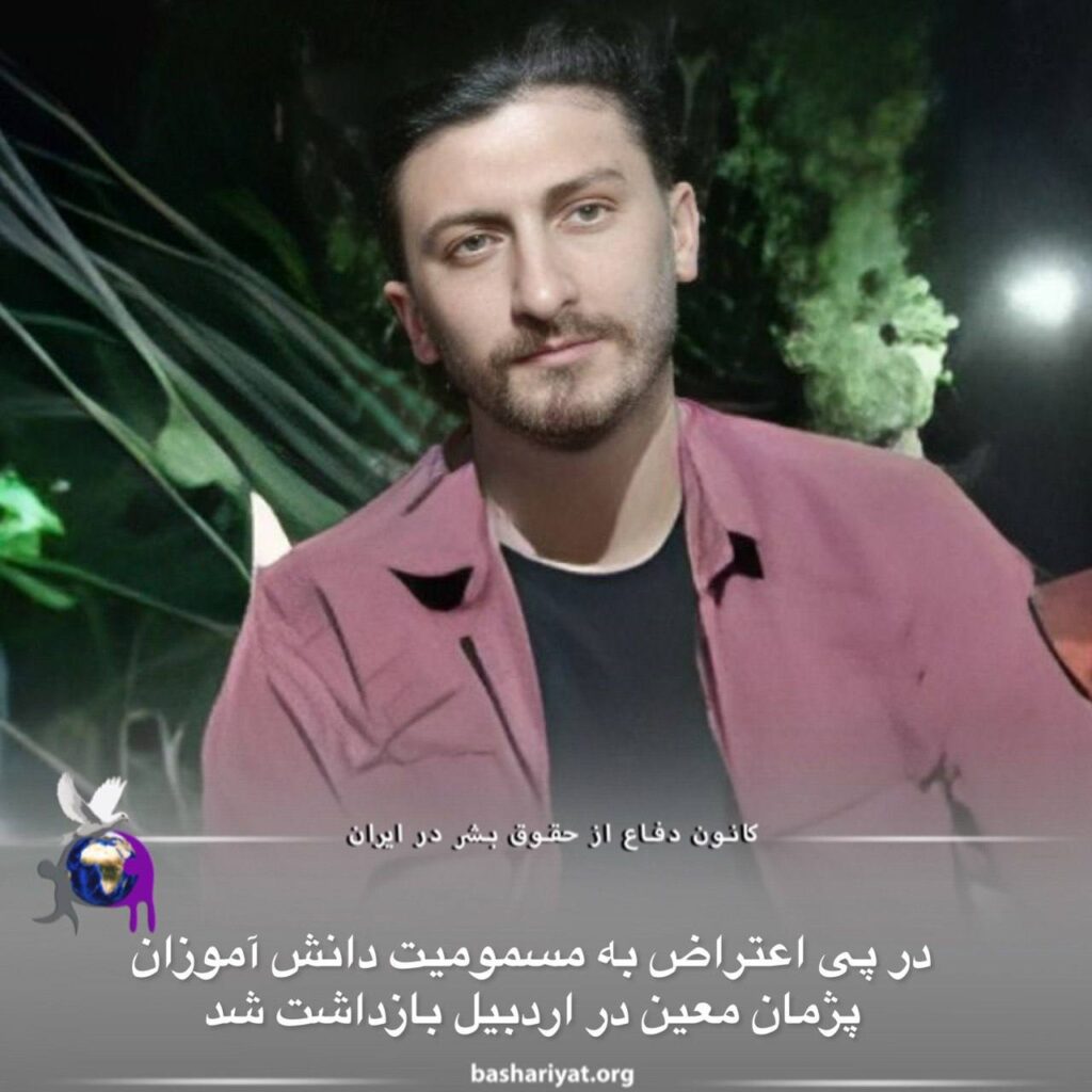 روز شنبه سیزدهم اسفند، #پژمان_معین شهروند ساکن #اردبیل در جریان تجمع اعتراضی خانواده های دانش آموزان مسموم شده، توسط نیروهای امنیتی بازداشت و به مکان نامعلومی منتقل شد.