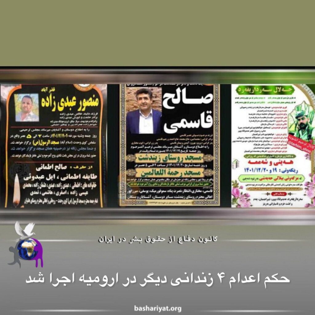 صبح جمعه ۱۹ بهمن، دستکم ۴ زندانی که به اتهامات مربوط به «مواد مخدر» به اعدام محکوم شده بودند ، در زندان مرکزی ارومیه #اعدام شدند. هویت ۳ تن از این زندانیان #سردار_جلالیفر اهل نقده، #صالح_قاسمی اهل روستای «زیندشت» #سلماس_عبدیزاده و #منصور_عبدیزاده اهل روستای «هفتوان» سلماس اعلام شده است.