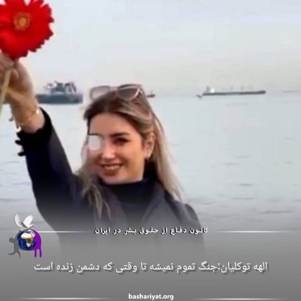 #الهه_توکلیان، دانشجویی که در اعتراضات با گلوله ماموران حکومتی یک چشمش را از دست داده، در پستی اینستاگرامی با اشاره به فشارها به خانوادهاش، اخراجش از کار و ممنوعیت ورودش به دانشگاه نوشت: «خوب گوش کن صدای قلبم را و خوب ببین جنایتت را… جنگ تموم نمیشه تا وقتی که دشمن زنده است.»