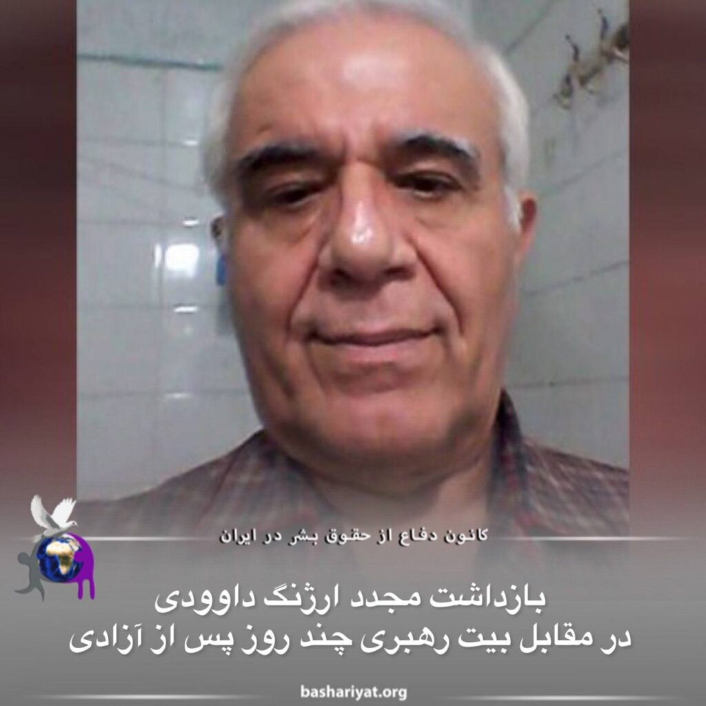 بر اساس گزارش منابع موثق، زندانی سیاسی ارژنگ داوودی هنگامی که به مقابل بیت خامنه ای رفته بود تا به مسموم کردن دختران دانش آموز، مصادره اموالش و ظلم و ستمی که طی ۲۰ سال گذشته متحمل شده اعتراض کند، توسط نیروهای حکومتی بازداشت شد.