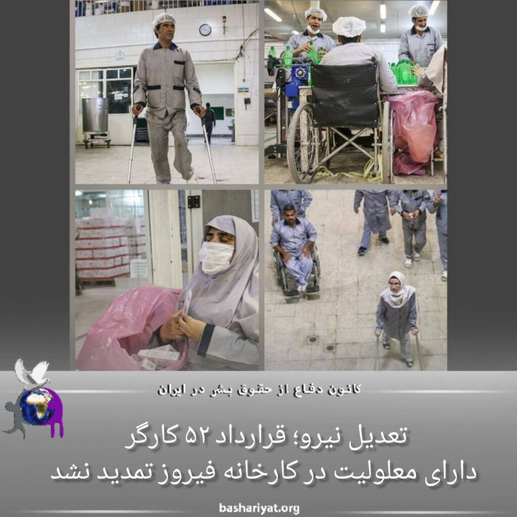 طی دو ماه گذشته، پنجاه و دو کارگر دارای معلولیت که در #کارخانه_فیروز واقع در شهرک صنعتی البرز قزوین مشغول کار بودند، با اتمام قرارداد کار بیکار شدند.براساس این گزارش، کارگران یاد شده که همگی از معلولان تحت حمایت بهزیستی و از اقشار ضعیف جامعه هستند، به دلیل پایان مدت قرارداد شغل خود را از دست دادهاند.طبق اظهارات کارگران؛ از قرار معلوم هریک از این کارگران حدد پنج تا پانزده سال سابقه کاری دارند و قرارداد کاری آنها پایان یافته است.