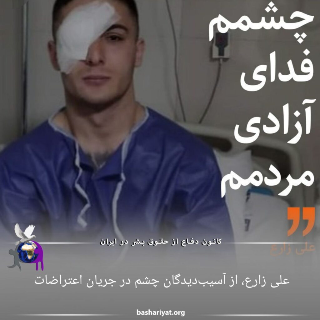 علی زارع، از آسیبدیدگان چشم در جریان اعتراضات، در یک پست اینستاگرامی نوشته: «درسته میگن خدا اگه یه چیزی ازت بگیره یه چیز دیگه بهت میده. چشم گرفت ولی قلب مردمم رو داد. چشمم فدای آزادی مردمم.»