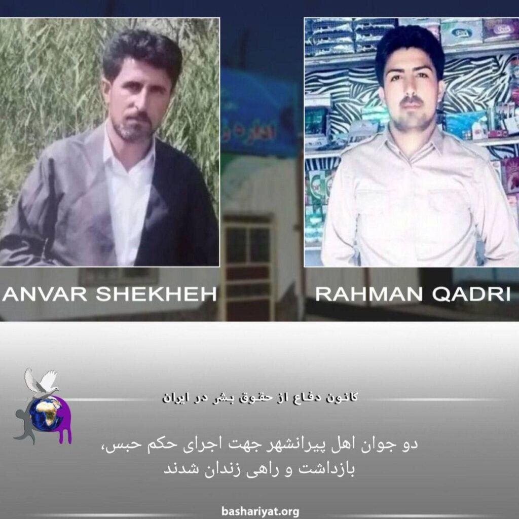 دو شهروند اهل شهرستان #پیرانشهر به نامهای #انور_شیخه و #رحمان_قادری که پیشتر توسط دستگاه قضایی جمهوری اسلامی #ایران به حبس محکوم شده بودند جهت اجرای احکام حبس بازداشت و به زندان نقده منتقل شدند.
