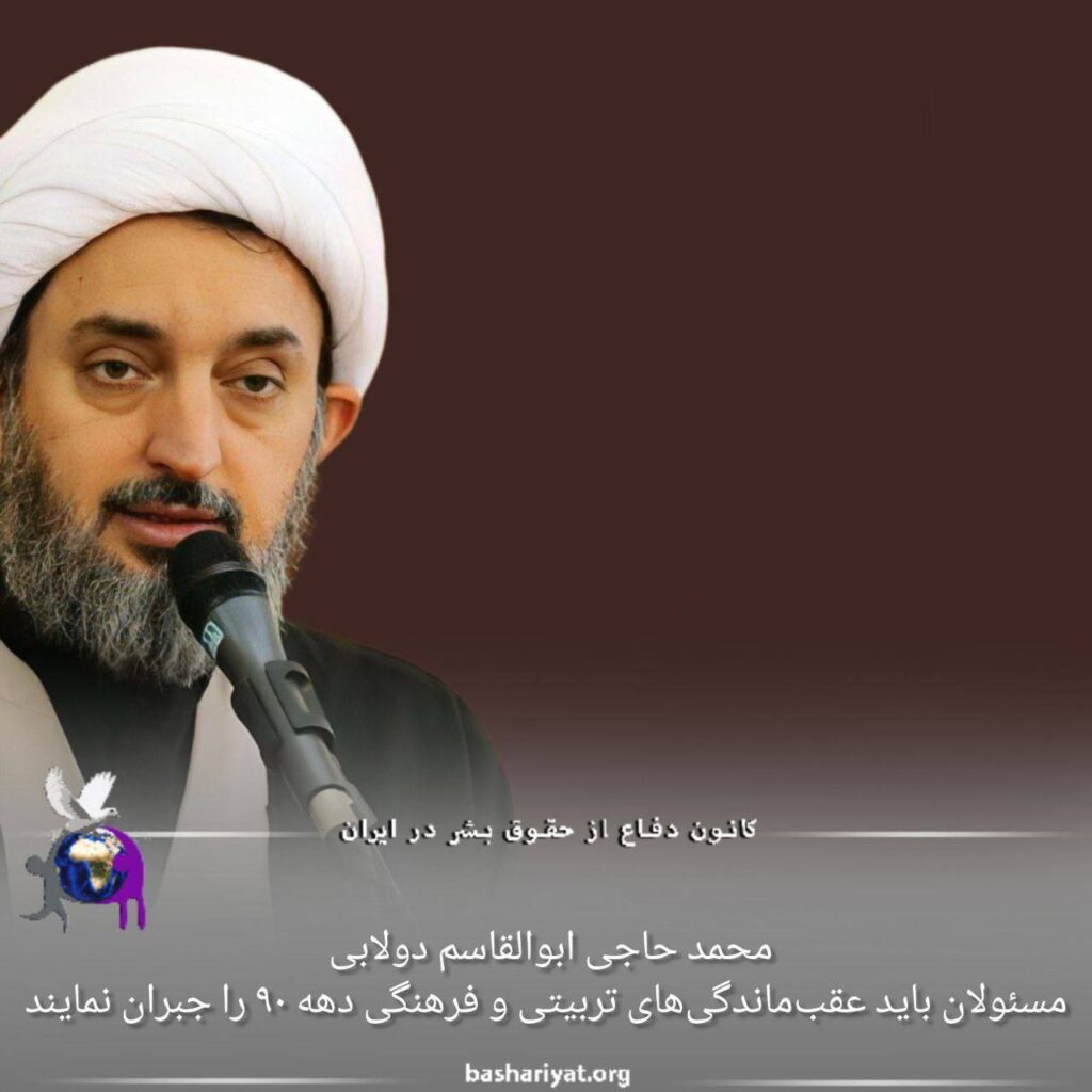 #محمد_حاجی_ابوالقاسم_دولابی، عضو مجلس خبرگان، گفت: «اماکن آموزشی باید به مراکز معنوی تبدیل شوند و متولیان این مراکز باید انسان های صالحی باشند تا تربیت غربی ترویج نشود و آسیب ها اجتماعی متوجه نوجوانان نشود.»این عضو مجلس خبرگان همچنین با بیان این که باید برای خدمت فرزندان به «دین و امام زمان» زمینهسازی شود، گفت: «مسئولان باید عقبماندگیهای تربیتی و فرهنگی دهه ۹۰ را جبران نمایند.»