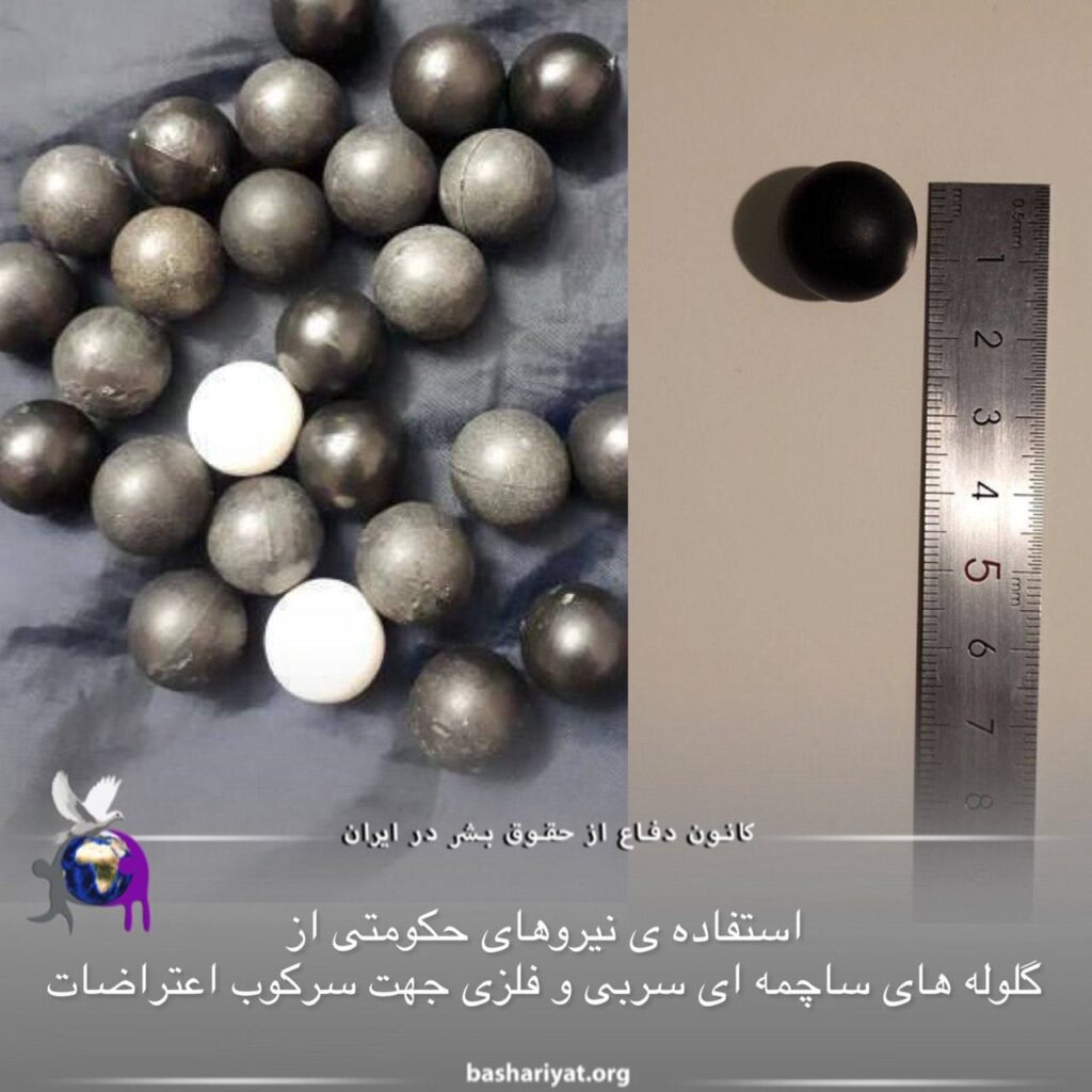 گلولههای ساچمهای جمعآوری شده از اعتراضات نشان میدهد نیروهای جمهوریاسلامی، از گلولههای ساچمهای سربی و فلزی استفاده میکنند و گلولههای پلاستیکی مورد استفادهیشان هم اندازهاش بسیار بزرگتر از آنچه است که در پروتکل جهانی ضد شورش آورده شده است.