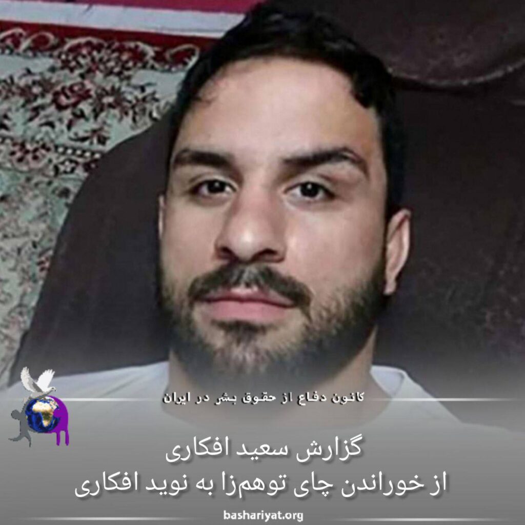 #ر، برادر #نوید_افکاری که جمهوری اسلامی او را اعدام کرد، در توئیتی نوشت، زمانی که برادرش در اداره آگاهی بود، بعد مدتها توانسته چند ثانیه مقابل آگاهی او را ببیند و متوجه شده که سر و بدن نوید به شدت ورم کرده و به شدت چاق شده است یا بهتعبیر سعید افکاری ورم کرده بوده.او اضافه کرده وقتی دو سال بعد، هر سه برادر به سلولهای انفرادی کنار هم منتقل شدند، «وحید از نوید پرسیده بود دلیل اون ورم چی بوده؟ نوید برایش گفته بود که اون روزهای اول تو بازجویی، بازجوها به اجبار مدام بهش چایی میدادن و این چاییها باعث میشد شکلی از توهم بیاد سراغش و ورم کنه. که بعدتر که اون روند قطع شد…»