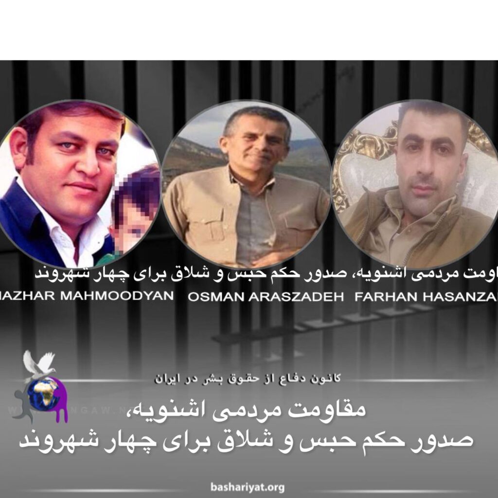 چهار شهروند اهل اشنویه با نام‌های #سلیمان_ارس‌زادە، #هژارمحمودیان، #فرحان_حسن‌زادە و #صنعان_قادرزادە (قالان) که پیشتر توسط نیروهای حکومتی بازداشت شده بودند، از سوی دستگاه قضایی جمهوری اسلامی ایران جمعاً به ۱۰ سال و ۶ ماه حبس و ۵۰ ضربه شلاق محکوم شدند.این شهروندان از بابت اتهامات “تبانی برای ارتکاب جرم برضد امنیت داخلی و خارجی، همکاری با احزاب کُردستانی مخالف نظام و تبلیغ علیه جمهوری اسلامی ایران” به حبس محکوم شدند. آنها پس از ١٨ روز بازجویی و انواع شکنجەهای روحی و روانی بە زندان اشنویە منتقل و پس از ٨ روز با قرار وثیقە بە صورت موقت تا پایان مراحل دادرسی از زندان آزاد شدە بودند.