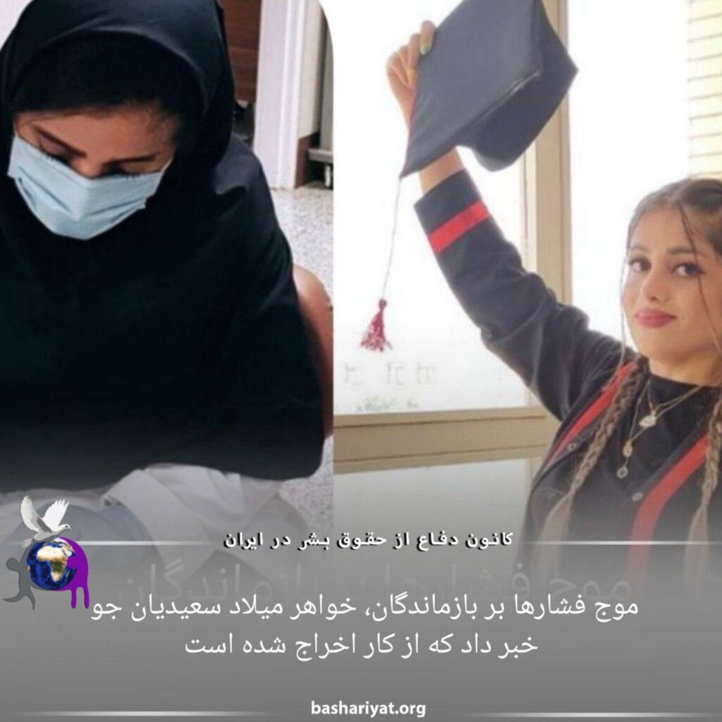 خواهر میلاد سعیدیانجو، از کشتهشدگان روز بیست و پنجم آبان در ایذه با انتشار توییتی نوشته که از کار اخراج شده است. او که به عنوان کادر درمان مشغول به کار بود نوشته است: «حتی تا آخر ماه هم صبر نکردند و وسط شیفت امشب بهم گفتن وسایل هاتو جمع کن برو…مطمئن باشید با این کارها دست از دادخواهی خون برادرم برنمی دارم.»