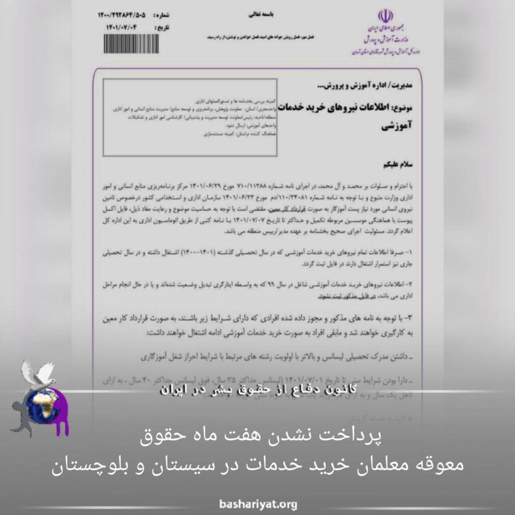 معلمان خرید خدمات سیستان و بلوچستان مدت هفت ماه است که از حقوق ماهیانه و بیمه خود بدلیل تخلفات مسئولین استان محروم شده اند.به گفته یکی از معلمین:«من یکی از ۲،۰۷۰ معلم خرید خدمات سیستان و بلوچستان هستم که قرار بود تبدیل وضعیت بشیم الان هفت ماه است که نه حقوقی گرفتیم نه بیمه هستیم والان بعد هفت ماه به دلیل تخلف مسئولین استان امور استخدامی کشور و وزارتخانه بخشنامه این استان را لغو کردن در صورتی که در تهران و مشهد معلمین خرید خدمات تعیین تکلیف شدند و کد پرسنلی و حقوق هفت ماه خود را دریافت کردند گرچه که تخلف مسولین بهانه ای بیش نیست دلیل این است که جمعه های اعتراضی زاهدان دلیل آن است و دولت و استاندار نظامی با توجه به شرایط ما میخواهد فشاری بر مسجد مکی و مولوی عبدالحمید وارد آورد».