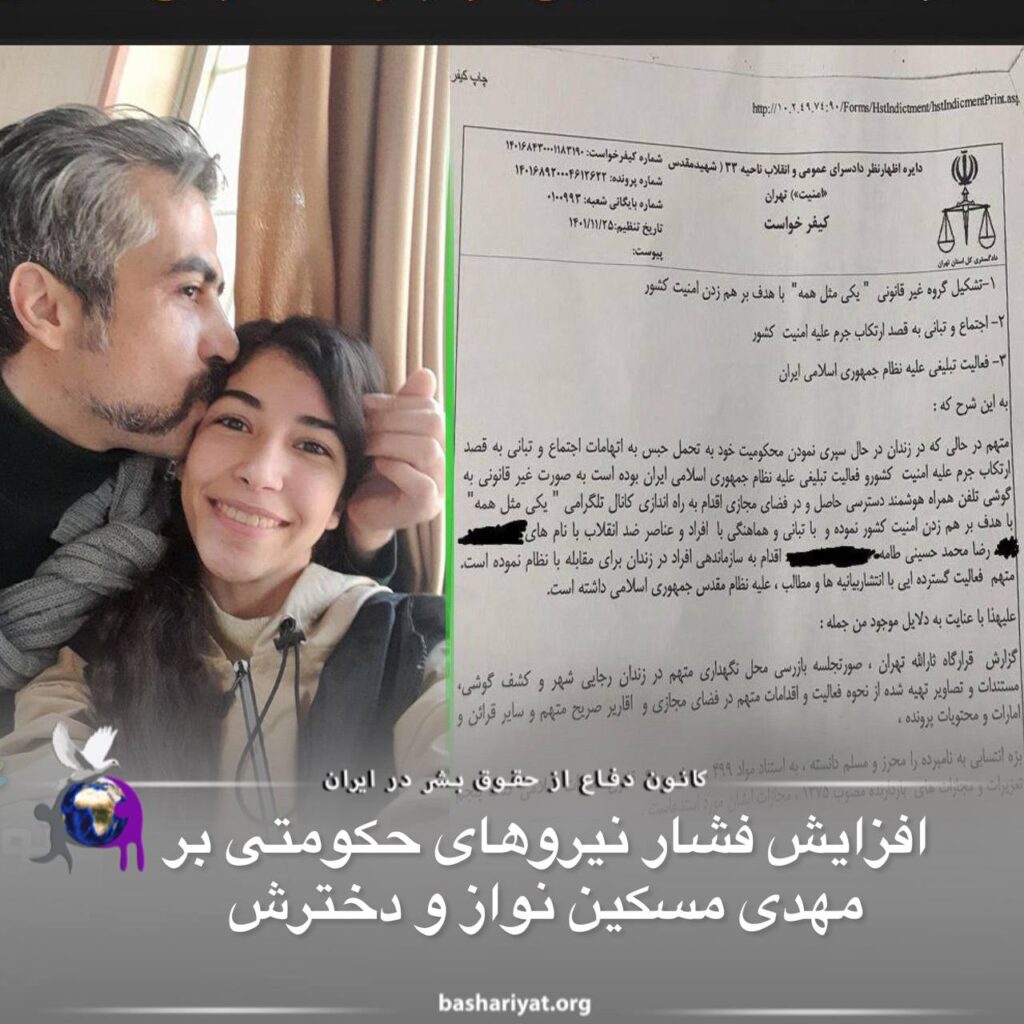 زندانی سیاسی، #مهدی_مسکین_نواز، در روز ۲۰ فروردین۱۴۰۲ از زندان #تهران بزرگ به زندان #اوین منتقل شده است، و از حق تماس تلفنی با خانواده و به خصوص دخترش محروم است.دختر وی چندی پیش حدود یک هفته در بازداشت بود و همچنان تحت فشار بازجویان اطلاعات سپاه است و آنها تلفنی با او تماس گرفته و تهدیدش میکنند و به او گفتهاند که شامل عفو نمیشوی و پروندهات را به جریان میندازیم! #عسل_مسکین_نواز ۲۲ فروردین در دادسرای اطفال جلسه بازپرسی داشت، اما با وجود اعلام وکالت آقای علی شریفزاده بازپرس وکیل او را نپذیرفت .اتهامهای اقای مسکین نواز ساخت گروه(داخل زندان) و اجتماعی و تبانی و تبلیغ علیه نظام است وی از دسترسی به وکیل تعیینی محروم هستند.