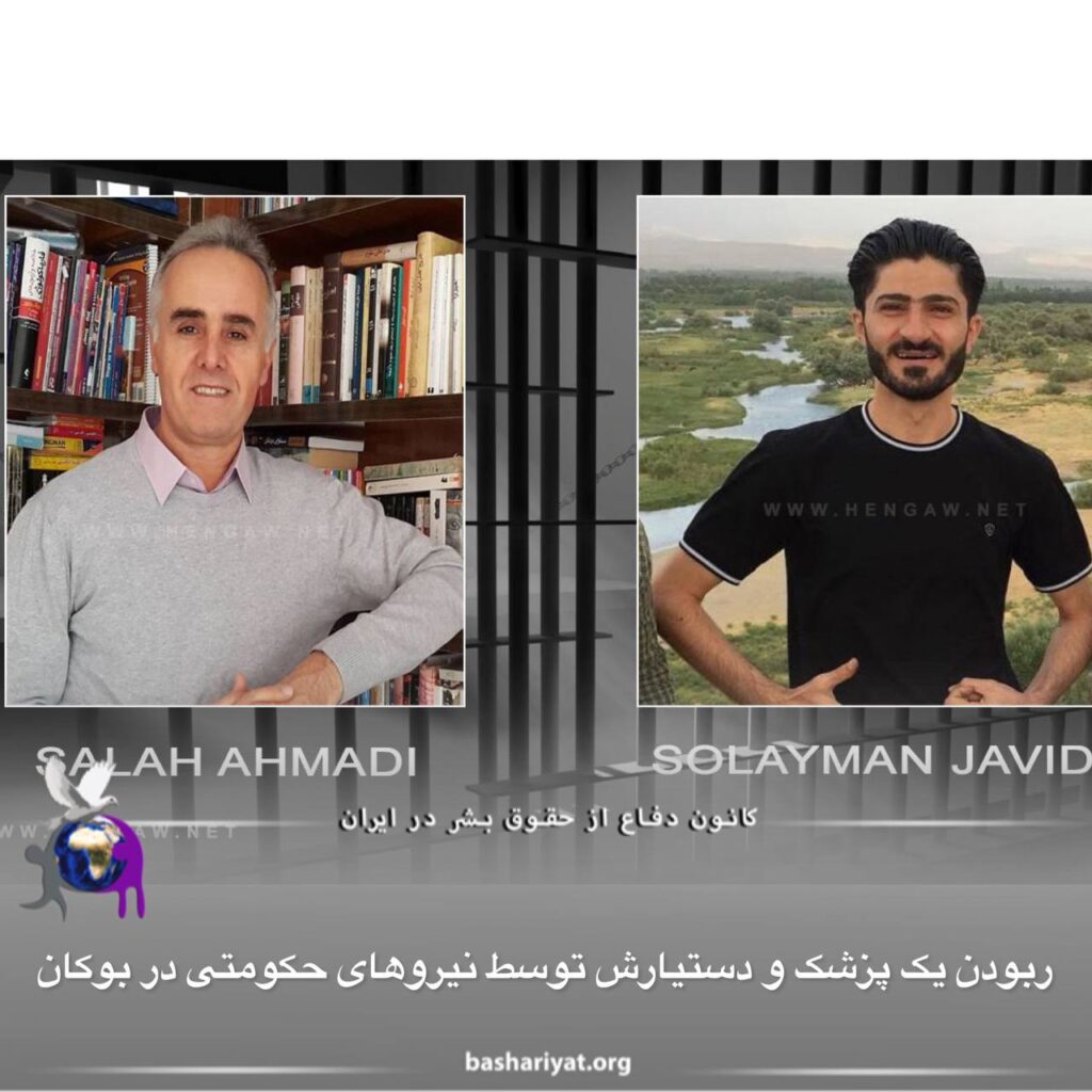 ۳۱ فروردین ،دکتر #صلاح_احمدی ۵۵ساله و دستیار وی، #سلیمان_جاوید ۳۵ ساله توسط نیروهای اداره اطلاعات #بوکان مورد ربایش قرار گرفته و به مکان نامعلومی منتقل شدند.