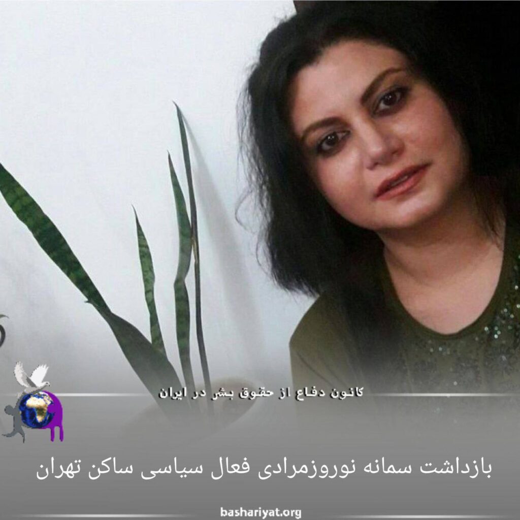 دوشنبه ٤ اردیبهشت ماه ١٤٠٢ #سمانه_نوروزمرادی، فعال سیاسی ساکن #تهران در منزل خود وقع در غرب تهران توسط ۱۲ نفر از نیروهای حکومتی بازداشت شد.از اتهامات مطروحه علیه در دسترس قرار نگرفته است.