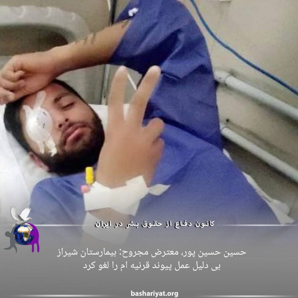 حسین حسینپور، جوان معترضی که با شلیک ماموران چشمش را از دست داده، خبر دادبیمارستانخ لیلی شیراز عمل قرنیه او را بدون دلیل لغو کرده و به او گفته دعا کن یک نفر بمیرد تا قرنیهاش را به تو پیوند بزنند.