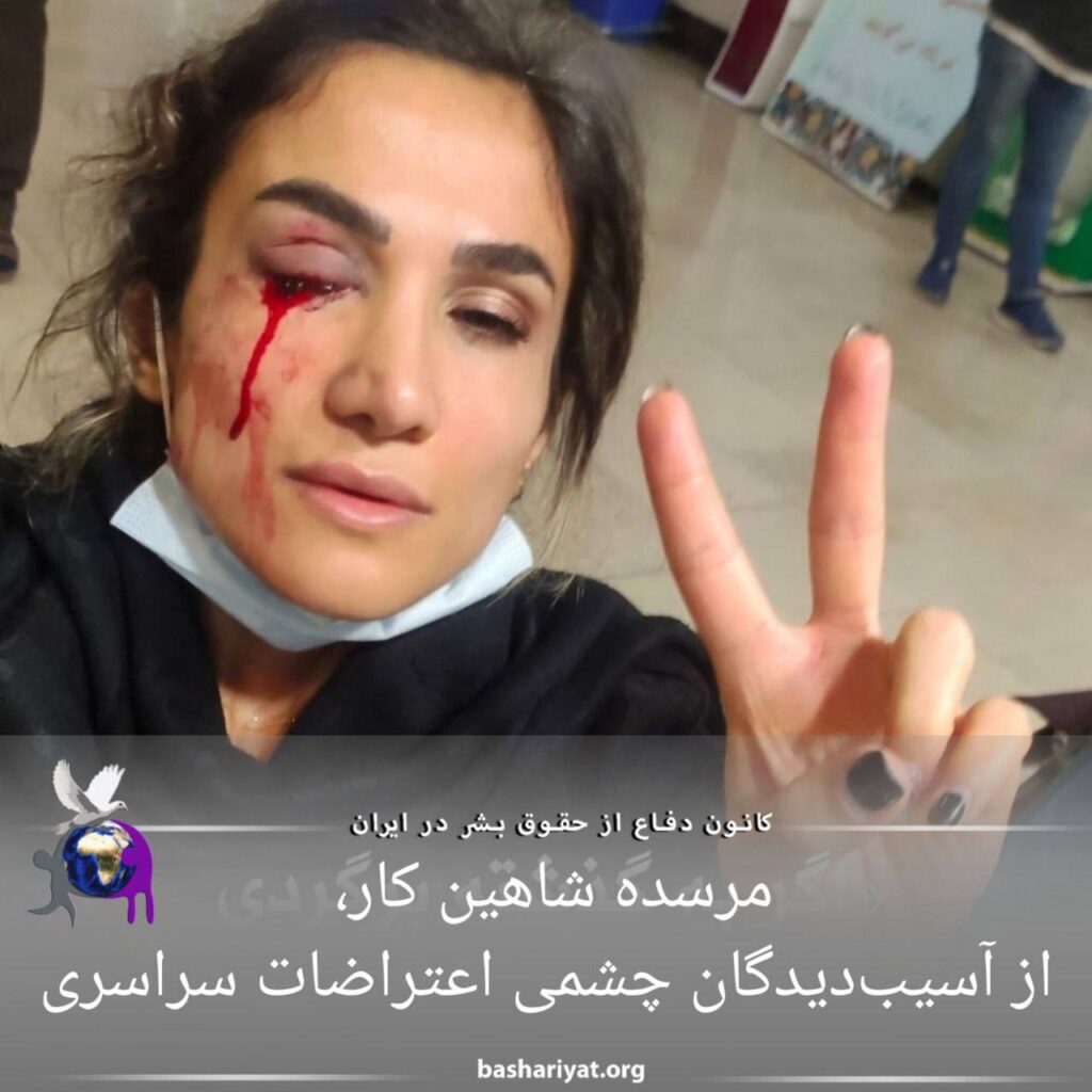 مرسده شاهین کار، از آسیبدیدگان چشمی اعتراضات سراسری با انتشار تصویری از خود با هشتگ «زن، زندگی، آزادی» در حساب توئیترش نوشت: «دیگه از دستم در رفته ۷ ماه یا ۸ ماه شده چه فرقی میکنه، مهم اینه که این روزا وقتی به تاریخ قبل از شنبه ۲۳ مهر ۱۴۰۱ فکر میکنم، با وجود بودنم توی یک برزخ و آینده نامعلوم، استرس شدید چندین ماهه، همش با خودم میگم اگه به گذشته برگردی چیکار میکردی؟!؟» مرسده شاهین کار، مربی بدنسازی است که در جریان اعتراضات سراسری یکی از چشمانش را بر اثر شلیک نیروهای حکومتی جمهوری اسلامی از دست داده است.