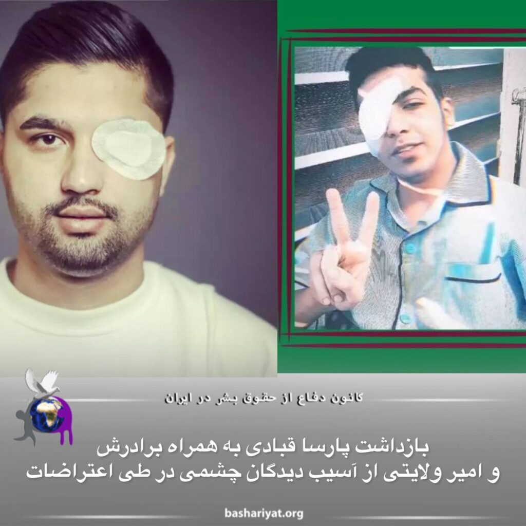 #امیر_ولایتی، معترضی که چشم خود را با شلیک گلوله ماموران حکومتی از دست داد، روز ۲۸ اردیبهشت بازداشت شده است. #پارسا_قبادی که دو چشمش هدف گلوله قرار گرفته، به همراه برادرش بازداشت و پس از چند روز آزاد شده، اما برادرش همچنان در بازداشت است.