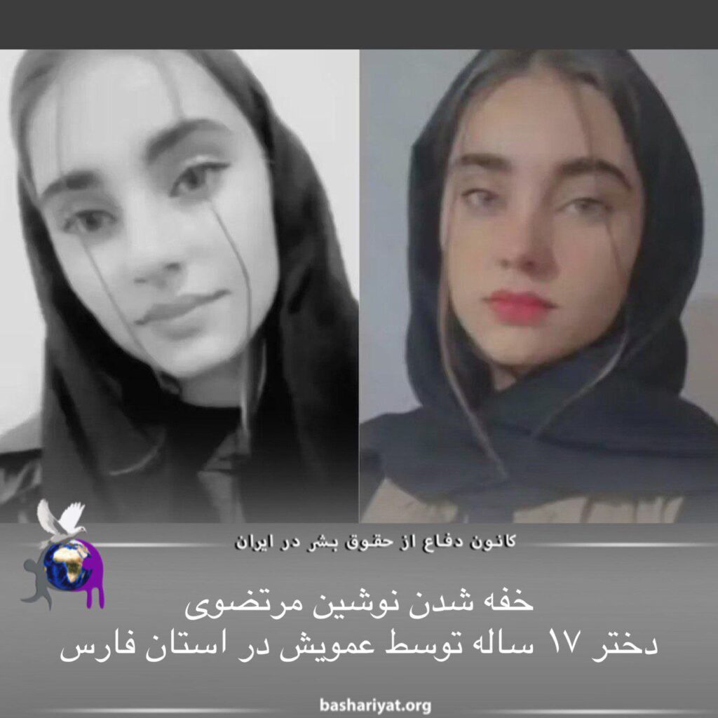 استان فارس؛ نوشین مرتضوی، دختر ۱۷ ساله اهل شهر قائمیه، روز شنبه ۲۴ تیر ۱۴۰۲ توسط عمویش خفه شده و سپس صورتش را له کرده تا شناسایی نشود.