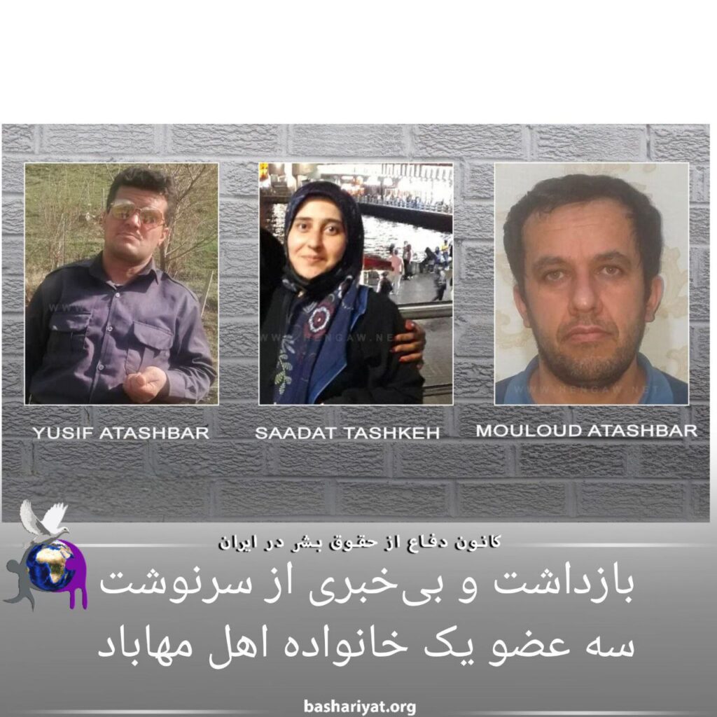 #سعادت_تاشکه، #مولود_آتشبار و #یوسف_آتشبار، سه عضو یک خانواده اهل #مهاباد از دو ماه پیش توسط نیروهای حکومتی در این شهرستان بازداشت شده و کماکان در بلاتکلیفی به سر میبرند. جان یوسف آتشبار با اتهام انتسابی “محاربه” در معرض خطر قرار دارد و هیچگونه اطلاعی از سرنوشت برادر و همسر برادرش، مولود آتشبار و سعادت تاشکه در دست نیست.