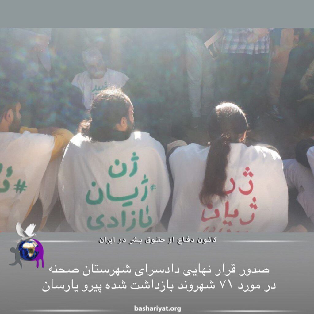قرار نهایی بازپرسی دادسرای شهرستان صحنه در مورد پرونده ٧١ نفر از جمله ۴ زن از شهروندان یارسان که سال گذشته در این شهر بازداشت شده بودند، صادر گردیده است.
