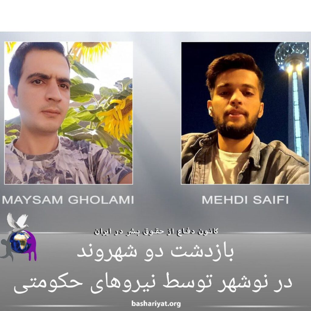 #مهدی_سیفی و #میثم_غلامی، دو فعال سیاسی اهل شهر #نوشهر از توابع استان #مازندران در تاریخ یازدهم مرداد۱۴۰۲توسط نیروهای حکومتی بازداشت و به مکان نامعلومی منتقل شدند.این دو شهروند پیشتر نیز، در سال ٩٩ توسط نیروهای حکومتی بازداشت شدند که مهدی سیفی پس از یکماه زندان و میثم غلامی متعاقب یکسال حبس، آزاد شدند.قابل ذکر است که، میثم غلامی در جریان جنبش زن، زندگی، آزادی در سال ١٤٠١ نیز، توسط نیروهای حکومتی برای مدتی بازداشت و سپس با تودیع وثیقه آزاد شده بود.