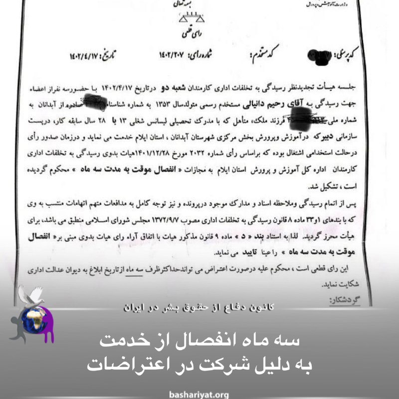 رحیم دنیالی دبیر اهل آبدانان با ۲۸ سال سابقه توسط هیئت رسیدگی به تخلفات اداری آموزش پرورش استانایلام به سه ماه انفصال خدمت و قطع رتبه بندی محکوم شد.