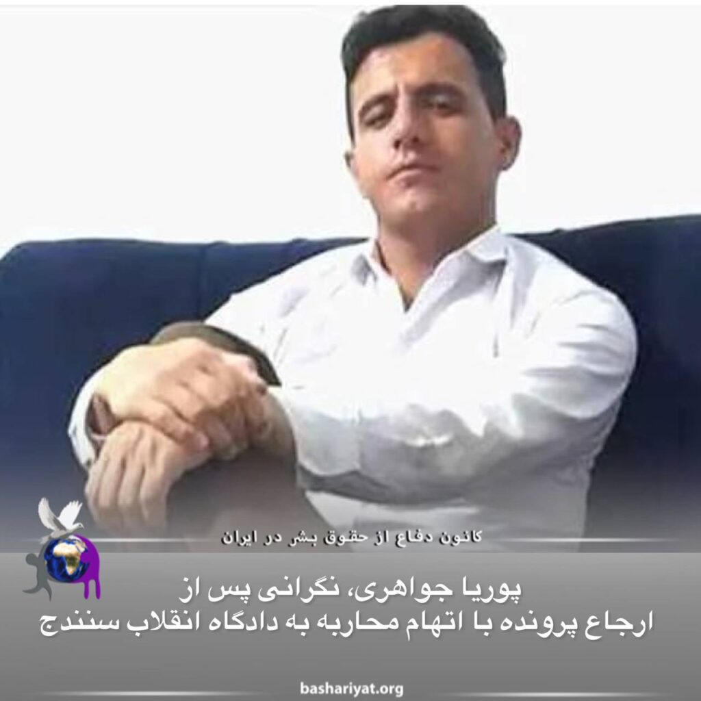 یکشنبه ۲۲ مرداد ۱۴۰۲، به گفته مصطفی احمدیان وکیل پوریا جواهری، پرونده او به اتهام «محاربه از طريق قتل عمدی یکی از پرسنل نظامی»، «عضویت در احزاب مخالف نظام»، «تبلیغ علیه نظام» و »ضرب و جرح عمدی چند مامور نظامی» به شعبه اول دادگاه انقلاب #سنندج ارجاع شده است. با ارجاع پرونده به اتهام «محاربه» نگرانی در خصوص صدور حکم اعدام در این پرونده وجود دارد.