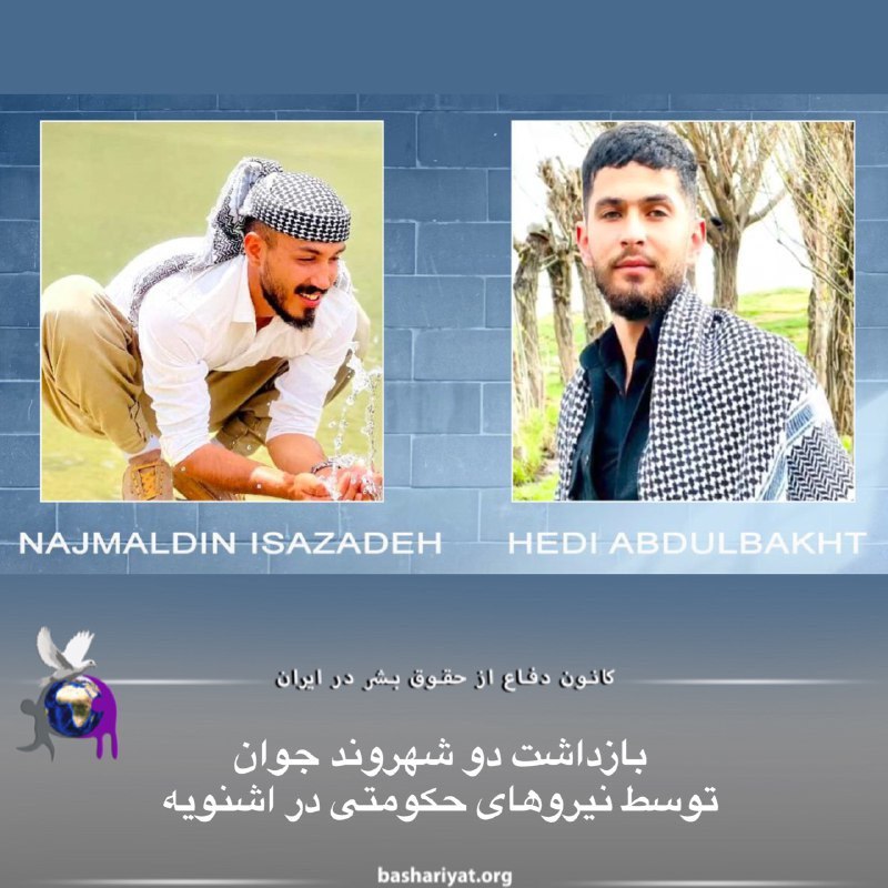 دو شهروند جوان اهل اشنویه (شنو) به نام‌های نجم‌الدین عیسی‌زاده و هیدی عبدالبخت، توسط نیروهای اداره اطلاعات بازداشت و به مکان نامعلومی منتقل شدند.