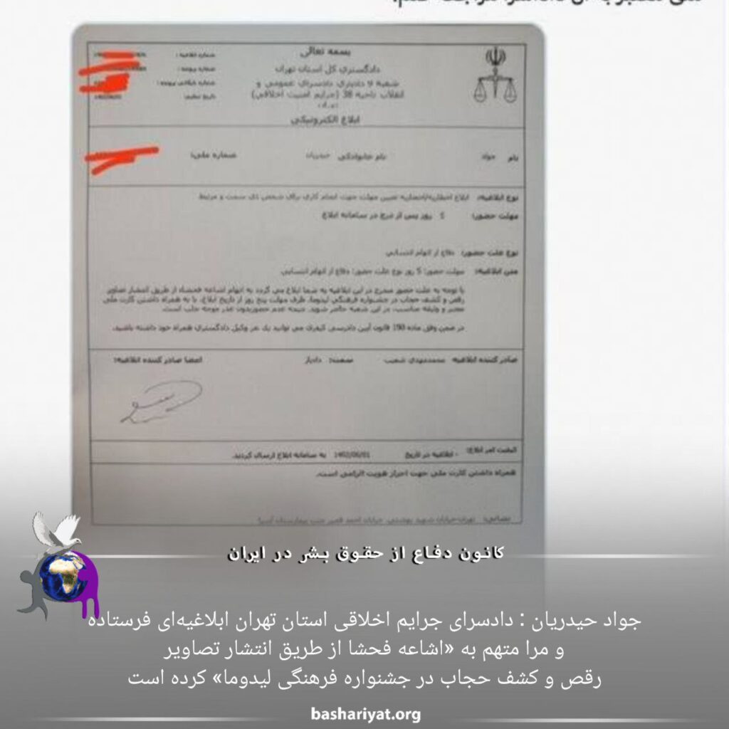 #جواد_حیدریان٬ خبرنگار و فعال محیط زیست در شبکه دادسرای جرایم اخلاقی استان #تهران ابلاغیه‌ای فرستاده و مرا متهم به «اشاعه فحشا از طریق انتشار تصاویر رقص و کشف حجاب در جشنواره فرهنگی لیدوما» کرده است. از امروز 5 روز وقت دارم با قرار وثیقه مناسب و کارت ملی معتبر به آن داداسرا مراجعه کنم.