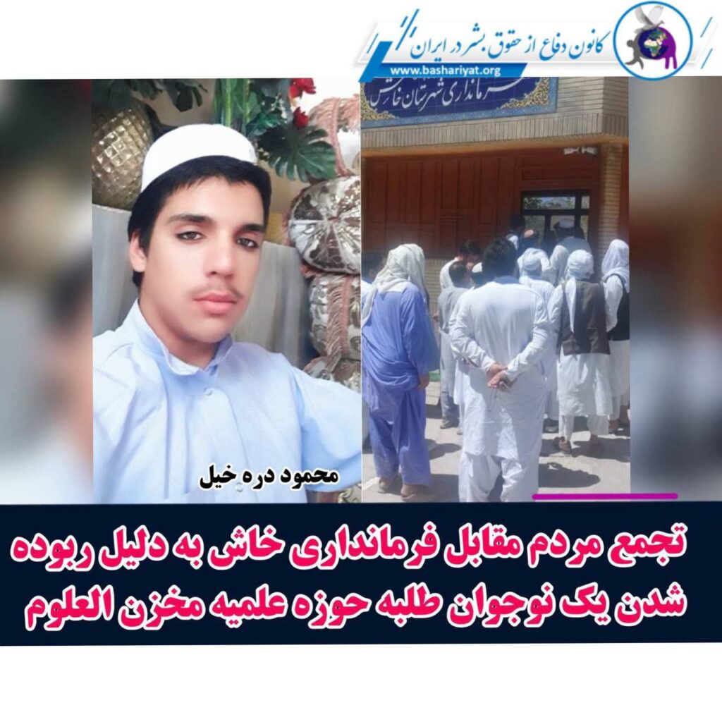 یک طلبه نوجوان حوزه علمیه مخزن العلوم #خاش که در ۲ شهریور ۱۴۰۲، توسط افراد مسلح ربوده شده و خانواده این کودک طرح شکایت کرده بوده اند به دلیل عدم پیگیری دستگاه های حکومتی ،۱۴ شهریور شماری از معتمدین و ریش سفیدان مقابل فرمانداری خاش تجمع کرده اند.هویت این کودک «#محمود_دره_خیل» ۱۷ ساله فرزند عبدالبشیر مهاجر افغان و متولد شهر خاش، طلبه حوزه علمیه مخزن العلوم و ساکن این شهر احراز شده است.به گفته منابع مطلع:« شامگاه دوم شهریور چند فرد مسلح با یک دستگاه خودروی پژو پرشیا محمود را از جلوی منزلش در خاش ربوده و پس از چند روز به خانواده اش در طی یک تماسی با شماره ناشناس در قبال آزادی او درخواست یک کیلو طلا کرده اند.»