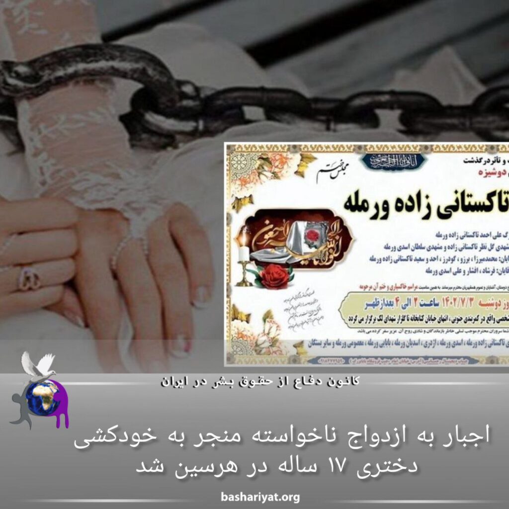 #پریا_تاکستانی_زاده_ورمله، دختر ١٧ ساله اهل شهر #هرسین از توابع #کرمانشاه (کرماشان) به دلیل تحت فشار بودن توسط خانواده برای ازدواج اجباری، به زندگی خود پایان داده است.