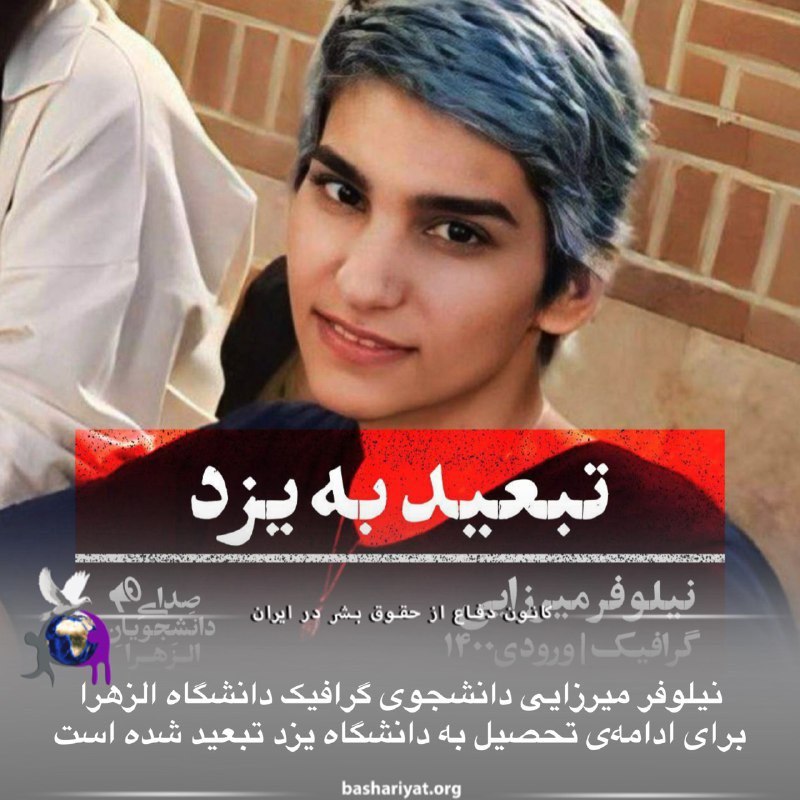 #نیلوفر_میرزایی دانشجوی گرافیک #دانشگاه_الزهرا طی حکم کمیتهی مرکزی وزارت علوم، برای ادامهی تحصیل به دانشگاه یزد تبعید شده است. همچنین در حین ابلاغ این حکم از ورود این دانشجو به دانشگاه ممانعت به عمل آمده و حکم به صورت شفاهی در گیت نگهبانی به ایشان ابلاغ شده است.