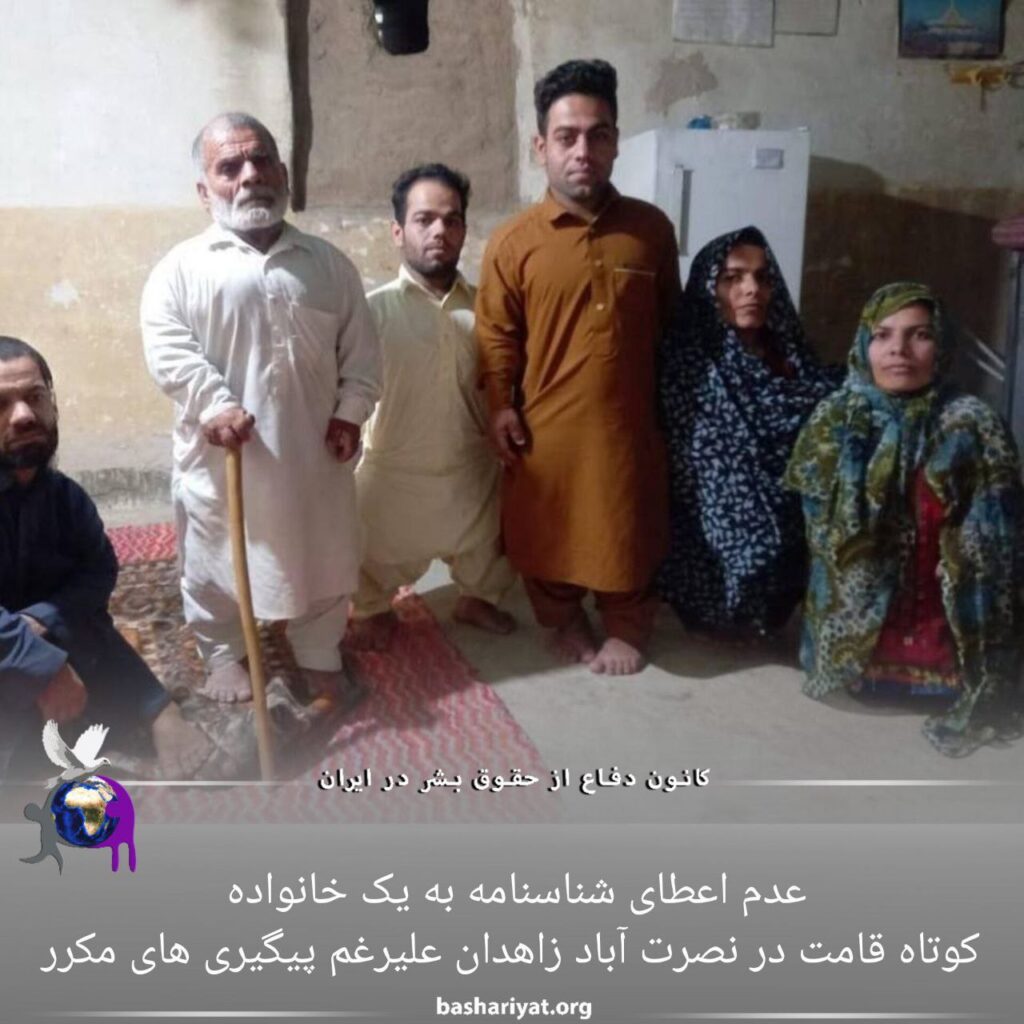 اعطای شناسنامه به یک خانواده کوتاه قامت در نصرت آباد زاهدان علیرغم پیگیری های مکرر یک خانواده کوتاه قامت بلوچ در شهر #نصرت آباد از توابع #زاهدان علیرغم سالها پیگیری و تحمل هزینههای سنگین رفت و آمد و سایر خرج های اداری، همچنان در انتظار دریافت شناسنامه هستند.در کنار کوتاه قامتی و نداشتن شغل و کار مناسب، بی توجهی مسئولان ادارات ذیربط به نداشتن شناسنامه و انجام سریعتر این پروسه علیرغم تلاش ها و پیگیری های زیاد این خانواده، به مشکلات آنها افزوده است.