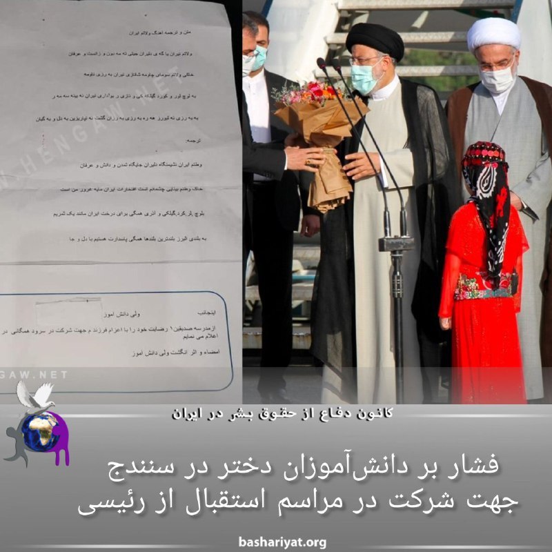 حراست اداره آموزشوپرورش #سنندج (سنه) دانشآموزان دختر را برای شرکت در یک مراسم سرودخوانی حکومتی در حاشیه ورود #ابراهیم_رئیسی به این شهر، تحت فشار قرار داده و آنها را به آنچه “برخورد انضباطی” عنوان شده، تهدید کرده است.