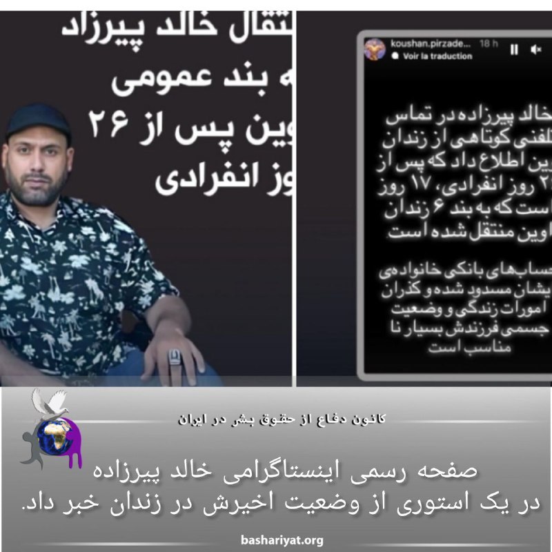 صفحه رسمی اینستاگرامی خالد پیرزاده در یک استوری از وضعیت اخیرش در زندان خبر داد. بر اساس اعلام این صفحه #خالد_پیرزاده ۱۷ روز پیش و پس از ۲۶ روز انفرادی، به بند ۶ #زندان_اوین منتقل شده‌ و توانسته با خانواده‌اش تماسی کوتاه بگیرد.
