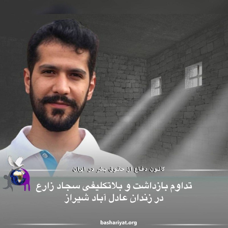 #سجاد_زارع، زندانی سیاسی سابق، علیرغم گذشت پنجاه و دو روز از زمان دستگیری، کماکان به صورت بلاتکلیف در زندان عادل آباد #شیراز بسر میبرد.سجاد زارع با اتهاماتی از جمله تبلیغ علیه نظام و اجتماع و تبانی مواجه است.آقای زارع توسط ماموران اطلاعات سپاه در منزل خود بازداشت و به بازداشتگاه اداره اطلاعات شیراز موسوم به پلاک ۱۰۰ منتقل شد.