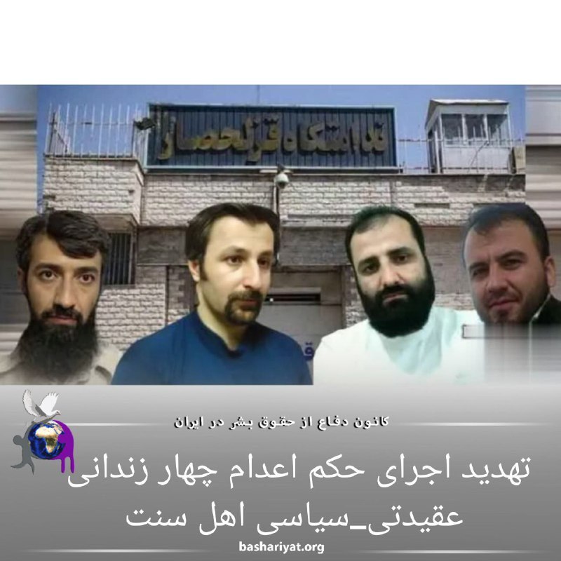 روز سه شنبه ۱۶ آبان ماه ۱۴۰۲ ، خطر اجرای حکم اعدام چهار زندانی عقیدتی – سیاسی در زندان قزلحصار #کرج و اهل سنت به نام های #ایوب_کریمی ، #داوود_عبداللهی ، #انور_خضری و #فرهاد_سلیمی پس از ۱۴ سال زندان و بلاتکلیفی بالا رفته است.