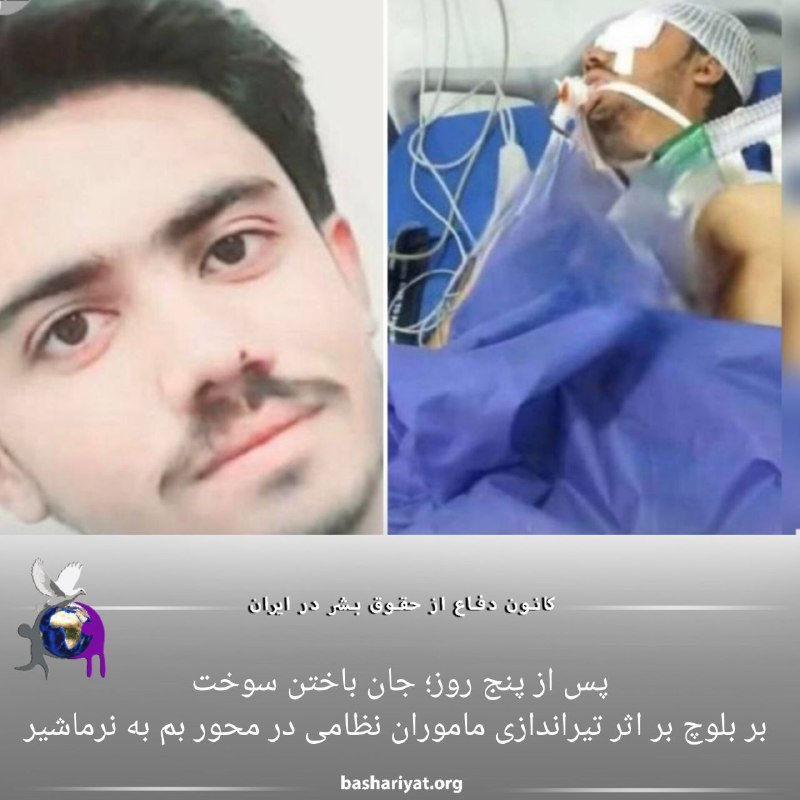 یک سوخت بر بلوچ پس از پنج روز جراحت ناشی از تیراندازی نیروهای حکومتی و واژگونی خودرو، جان باخت.هویت این سوخت بر بلوچ #محمد_طارق_شه_بخش ۲۰ ساله فرزند #خدابخش اهل روستای #چاه_زرد_شهرستان #زاهدان عنوان شده است.