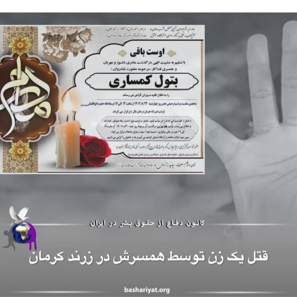 یک زن میانسال بنام #بتول_کمساری، در شهر #زرند استان #کرمان به دلیل آنچه اختلافات خانوادگی عنوان شده، توسط همسر خود به قتل رسید.